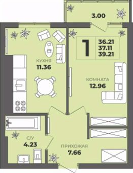 Продаётся 1-комнатная квартира в строящемся доме (Дом 2), срок сдачи: II-кв. 2027, общей площадью 37.11 кв.м., на 8 этаже. ЖК "ГРИНВУД".