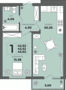 Продаётся 1-комнатная квартира в строящемся доме (Дом 1), срок сдачи: II-кв. 2027, общей площадью 43.52 кв.м., на 2 этаже. ЖК "ГРИНВУД".