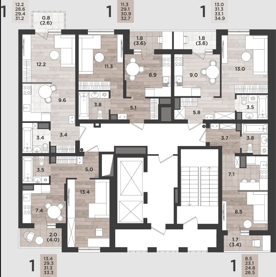 Эргономичные и продуманные планировки с просторными кухнями-гостиными и гардеробными, системами хранения, мастер-спальнями.