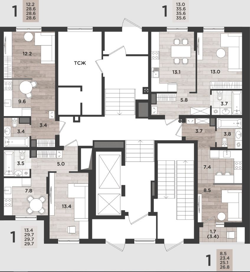 Эргономичные и продуманные планировки с просторными кухнями-гостиными и гардеробными, системами хранения, мастер-спальнями.