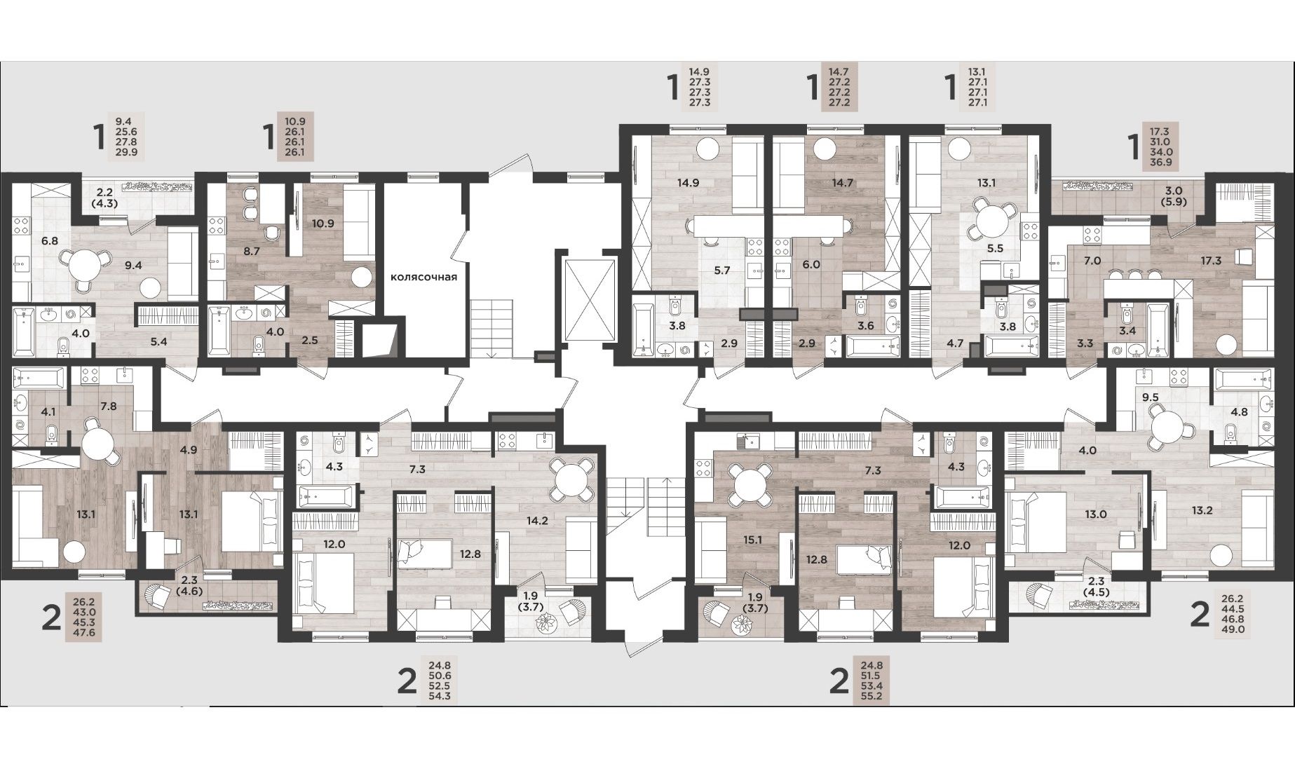 Эргономичные и продуманные планировки с просторными кухнями-гостиными и гардеробными, системами хранения, мастер-спальнями.