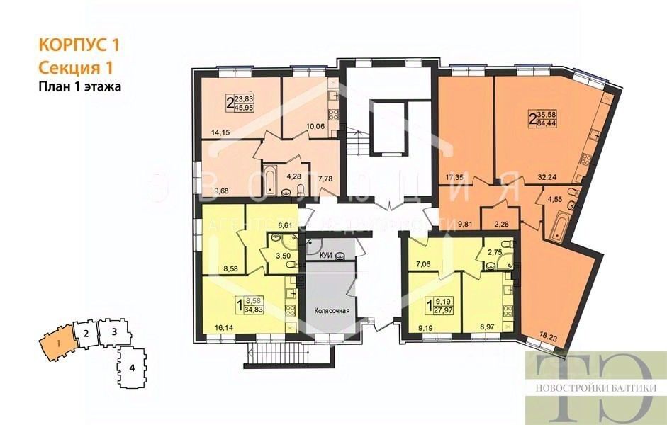 Квартира: 2 к 84,44 кв.м., 1 этаж в комплексе Резиденция, 1 очередь, корп.1, сдача: 2кв. , этажей: 5, адрес Пионерский г., Комсомольская ул., д. 19, Застройщик: Зеленый Город.