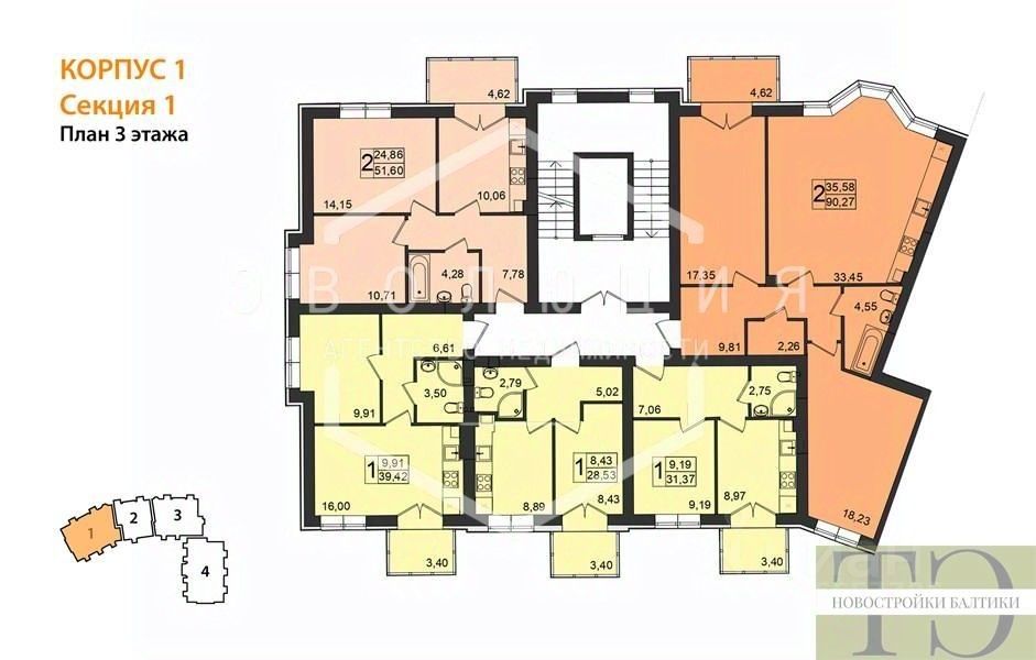Квартира: 2 к 87,04 кв.м., 3 этаж в комплексе Резиденция, 1 очередь, корп.1, сдача: 2кв. , этажей: 5, адрес Пионерский г., Комсомольская ул., д. 19, Застройщик: Зеленый Город.