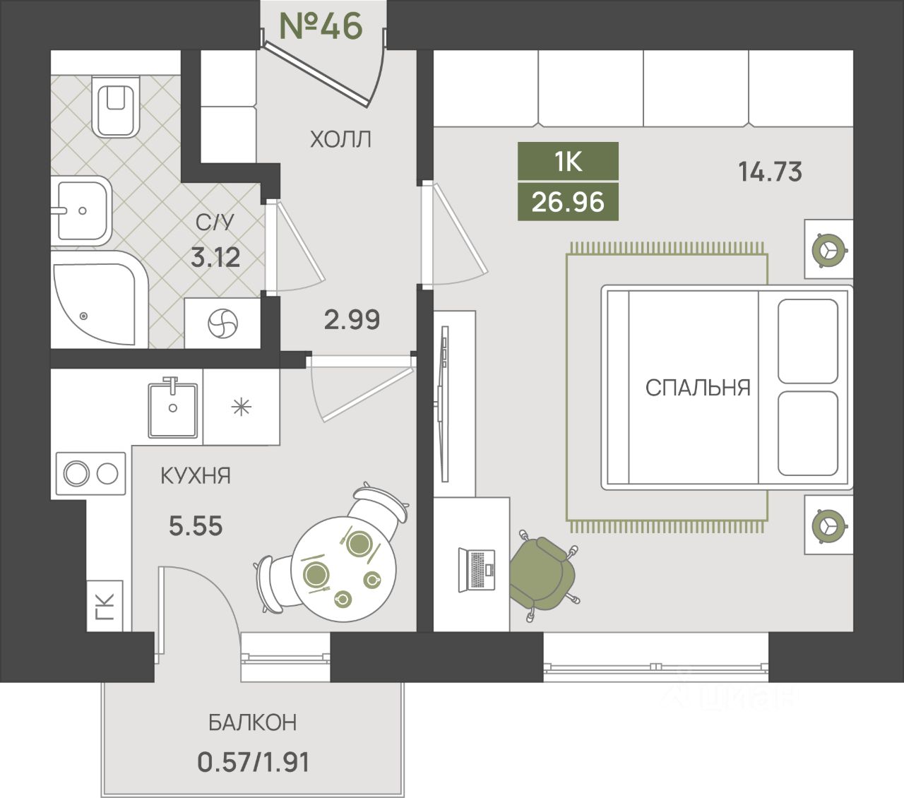 Общая площадь26,96 м²
