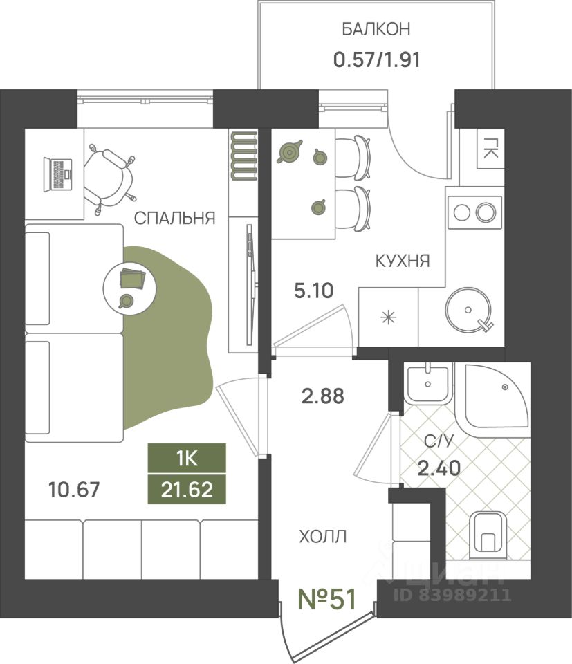 Общая площадь21,62 м²