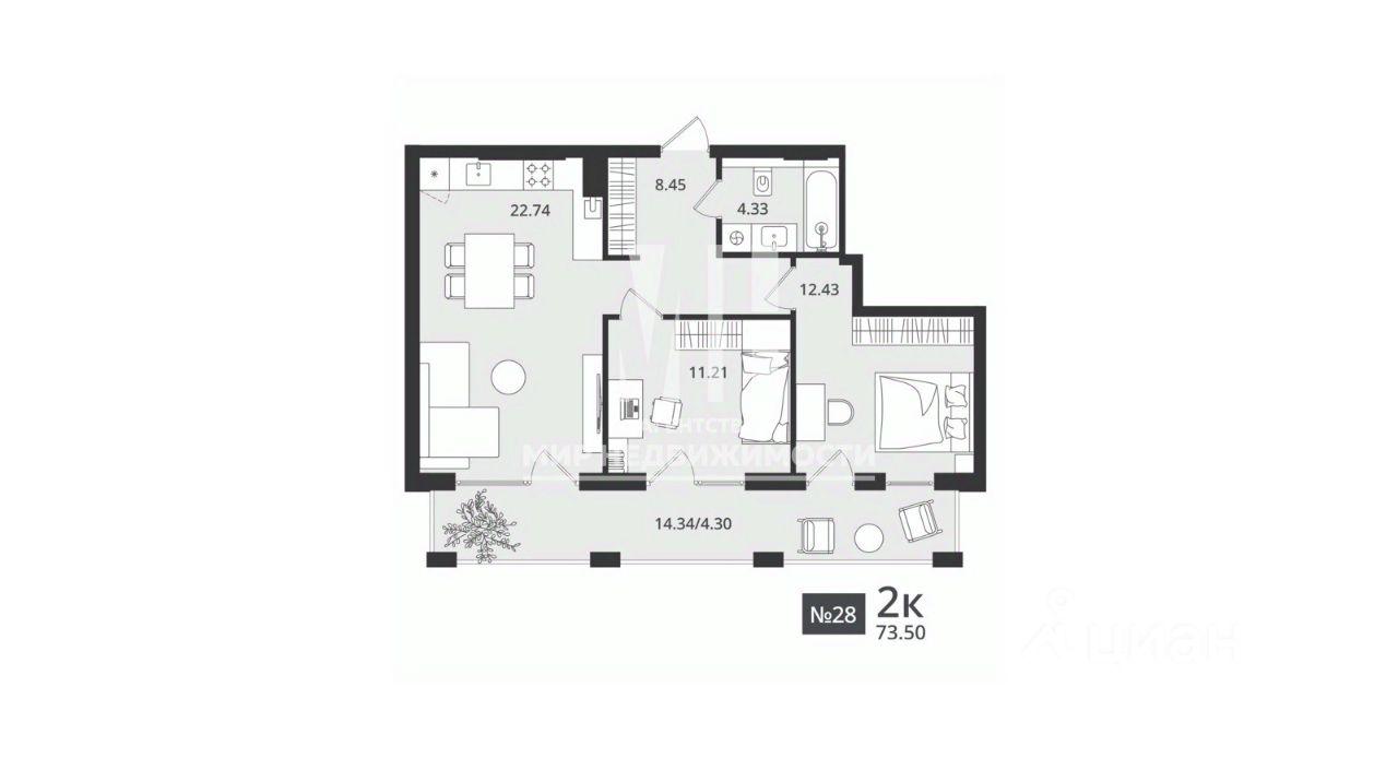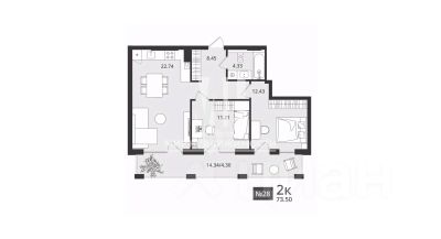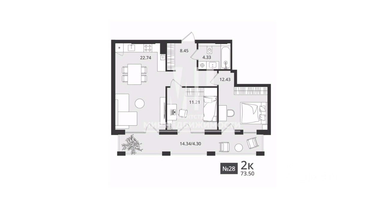 Удачное планировочное решение позволяет организовать комфортное пространство из видовой спальни и просторной кухни-гостиной площадью 22,74 кв.м.