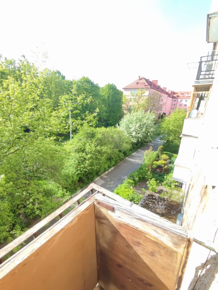 балкон с выходом на тихий и зелёный двор. Из окна не видно ни одного дома, только деревья.