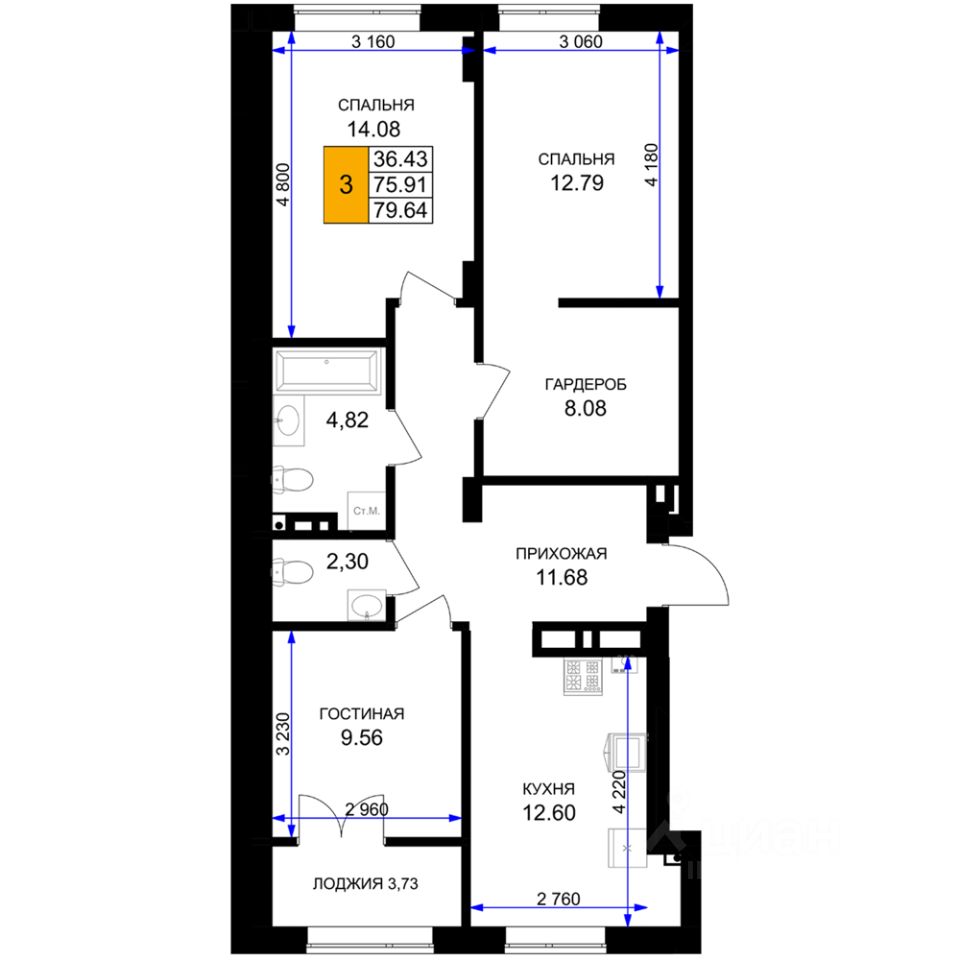 Общая площадь79,64 м²