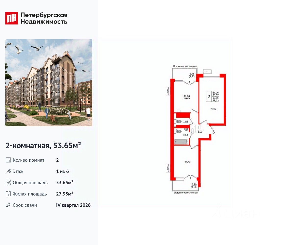 Удобная, классическая планировка, кухня 10.98 м², вместительная прихожая 6 м². Общая площадь квартиры - 53.65 м², жилая 27.95 м², высота потолка 3 м.