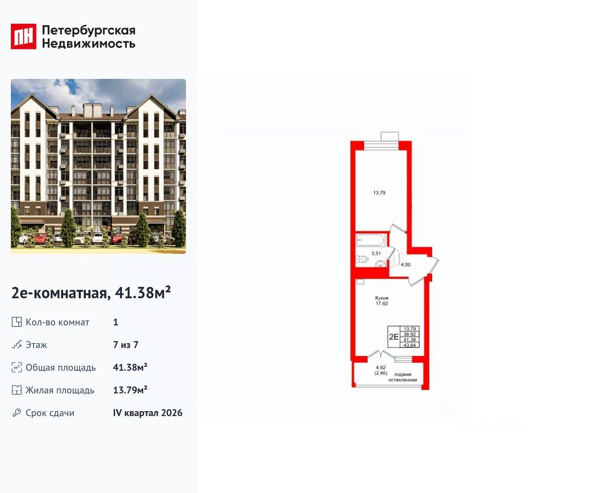 Удобная, классическая, функциональная европланировка, большая кухня-гостиная 17.62 м², вместительная прихожая 4 м². Общая площадь квартиры - 41.38 м², жилая 13.79 м², высота потолка 3.3 м.