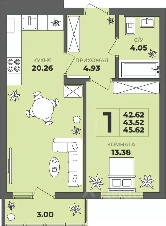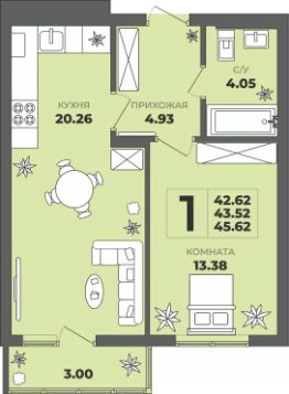 Продаётся 1-комнатная квартира в строящемся доме (Дом 1), срок сдачи: II-кв. 2027, общей площадью 43.52 кв.м., на 3 этаже. ЖК "ГРИНВУД".