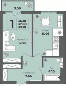 Продаётся 1-комнатная квартира в строящемся доме (Дом 2), срок сдачи: II-кв. 2027, общей площадью 37.08 кв.м., на 4 этаже. ЖК "ГРИНВУД".