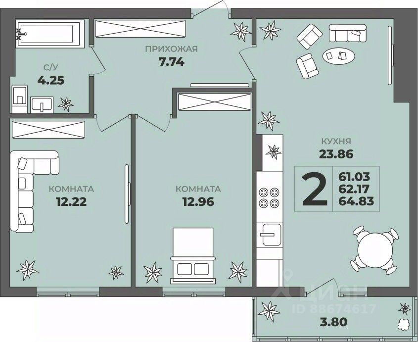Продаётся 2-комнатная квартира в строящемся доме (Дом 2), срок сдачи: II-кв. 2027, общей площадью 62.17 кв.м., на 1 этаже. ЖК "ГРИНВУД".