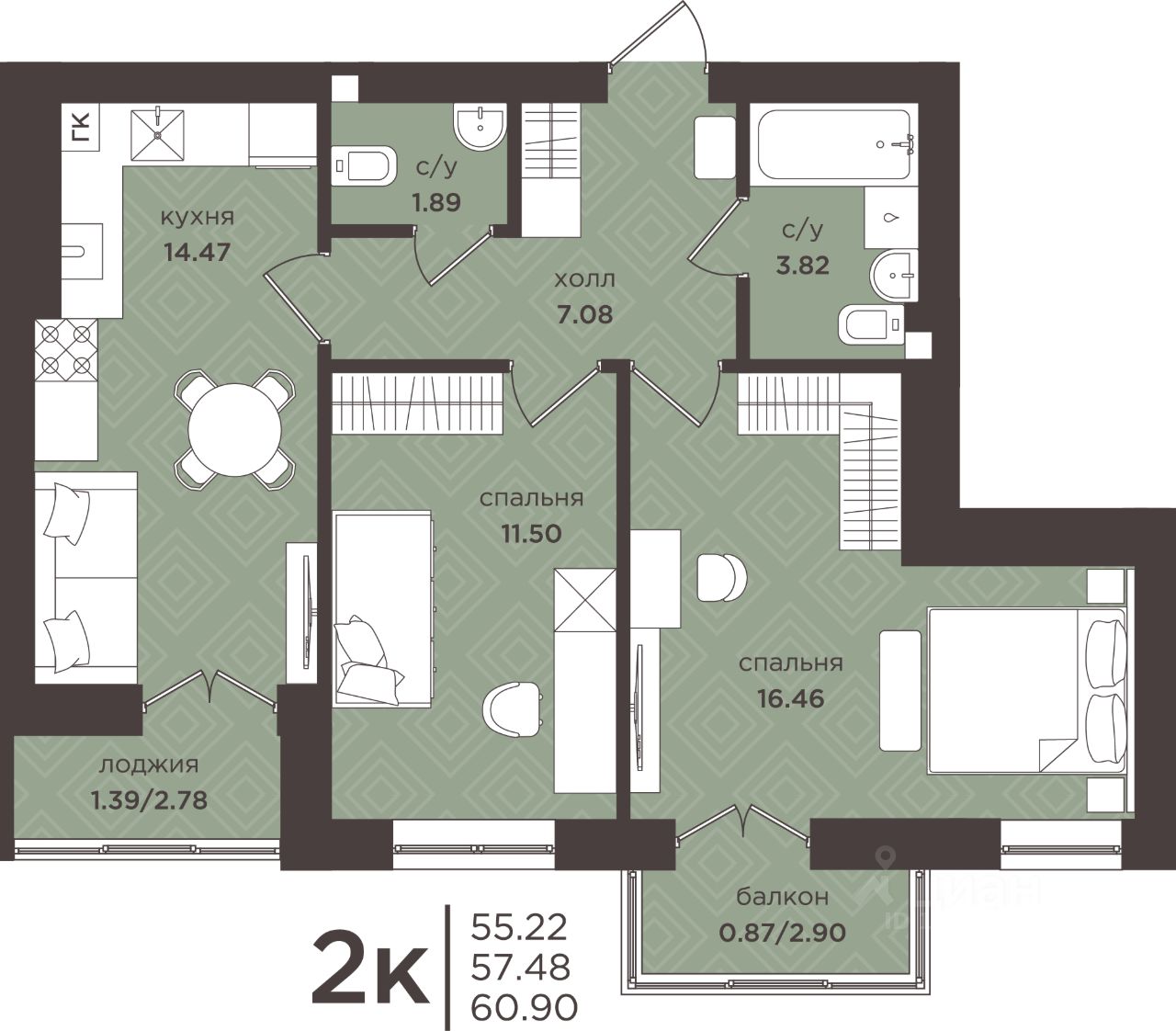 Продаётся 2-комнатная квартира в строящемся доме (ГП-1), срок сдачи: IV-кв. 2027, общей площадью 57.48 кв.м., на 5 этаже. БEСПPОЦEНTНAЯ ДОЛГOCPОЧНAЯ PАCСРОЧKA ОТ ЗАCТРOЙЩИKА дo 31.03.2027 годa с пepвoначaльным взноcом 30%. Без ежемесячных платежей и с фиксацией цены.