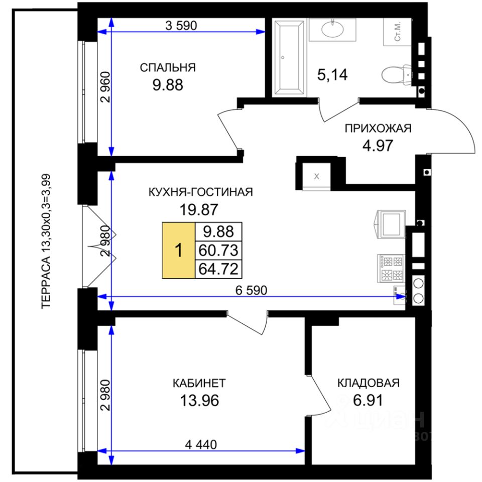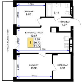 Продаётся 1-комнатная квартира в строящемся доме (Дом 2 (1 очередь)), срок сдачи: IV-кв. 2025, общей площадью 64.72 кв.м., на 1 этаже. Новый жилой комплекс "Включи" от застройщика "СпецСтройКубань" расположен в г. Гурьевск в районе Гурьевского шоссе.