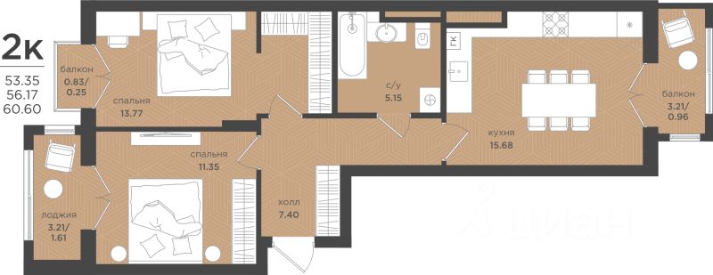 Продаётся 2-комнатная квартира в строящемся доме (ГП1, 1 этап), срок сдачи: IV-кв. 2026, общей площадью 56.17 кв.м., на 4 этаже. Новый жилой комплекс "Вишневый квартал" от компании "Эллипс" расположен в пос. Вишневое Калининградской области на ул. Глазурная.