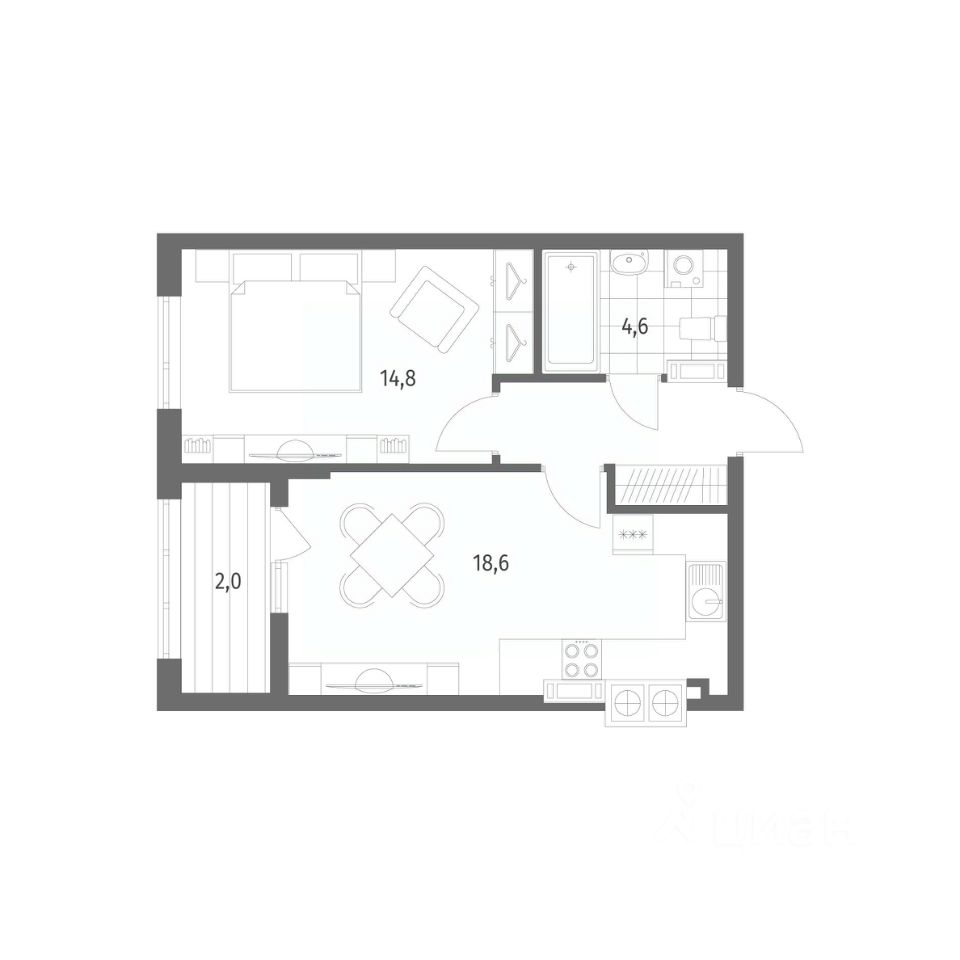 в Дом на Красной от компании ГК "ТРЕСТ". Площадь кухни 18.6 м². Жилой комплекс комфорт-класса "Дом на Красной" расположен в Центральном районе Калининграда на пересечении улиц Красная и Псковская. Жилой комплекс включает в себя два дома высотой 8 этажей. Срок сдачи намечен на 4 квартал 2026 года.