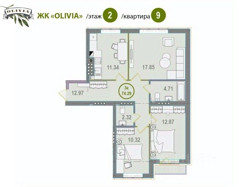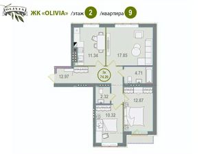 Квартира расположена на 2 этаже четырехэтажного дома из керамического кирпича, общая площадь квартиры 74.29 кв.м, жилая 41.04 кв.м (все комнаты изолированные), кухня 11.34 кв.м, два санузла. Есть балкон.