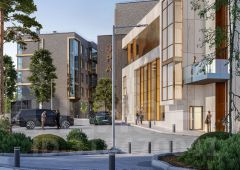 Элегантный дизайн: фасад здания отделан элитными материалами, такими как клинкерная плитка и медные панели, выдерживающие испытание временем.