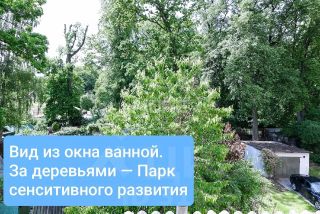 Во дворе на клумбах пионы, тюльпаны и другие цветы. Окна выходят во двор, шума улицы не слышно, только пение птиц (видео прикреплено).