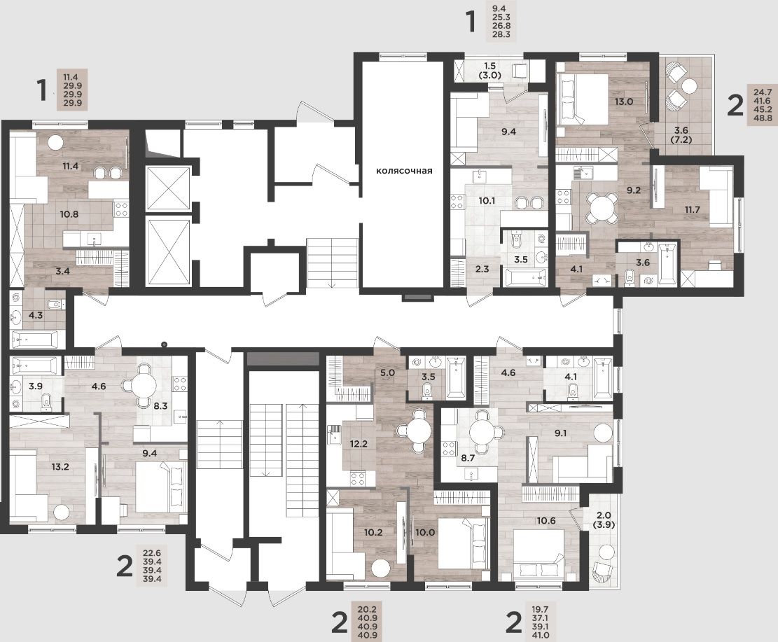 Эргономичные и продуманные планировки с просторными кухнями-гостиными и гардеробными, системами хранения, мастер-спальнями.