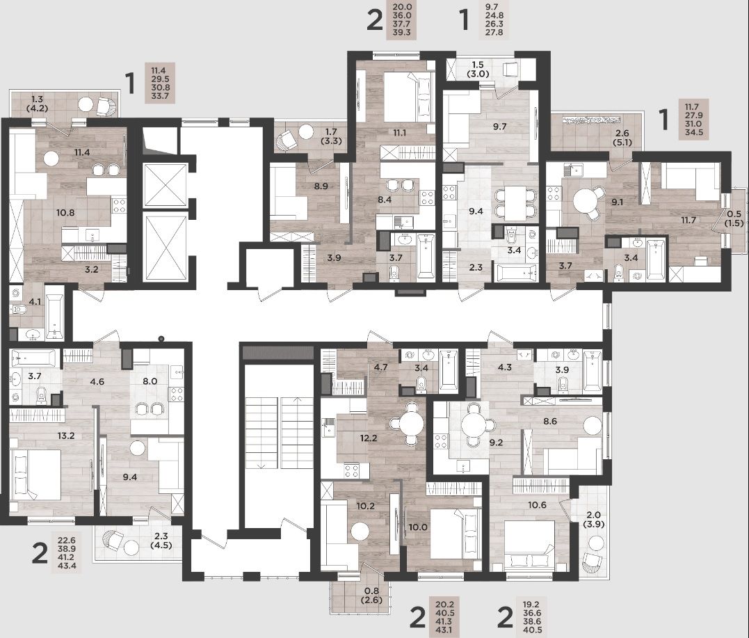 Эргономичные и продуманные планировки с просторными кухнями-гостиными и гардеробными, системами хранения, мастер-спальнями.