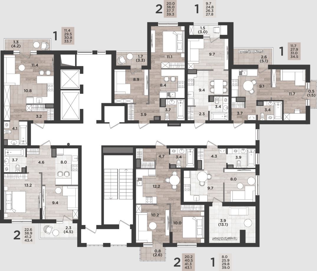 Эргономичные и продуманные планировки с просторными кухнями-гостиными и гардеробными, системами хранения, мастер-спальнями.