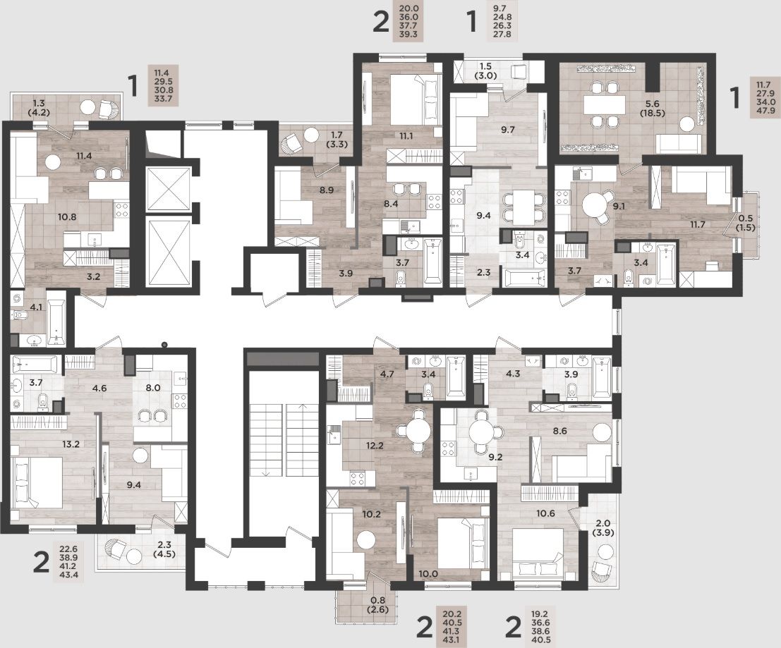 Эргономичные и продуманные планировки с просторными кухнями-гостиными и гардеробными, системами хранения, мастер-спальнями.