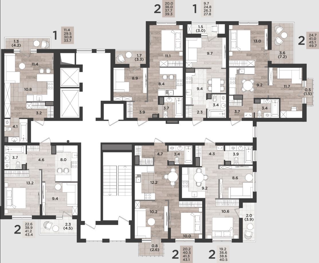 Эргономичные и продуманные планировки с просторными кухнями-гостиными и гардеробными, системами хранения, мастер-спальнями.