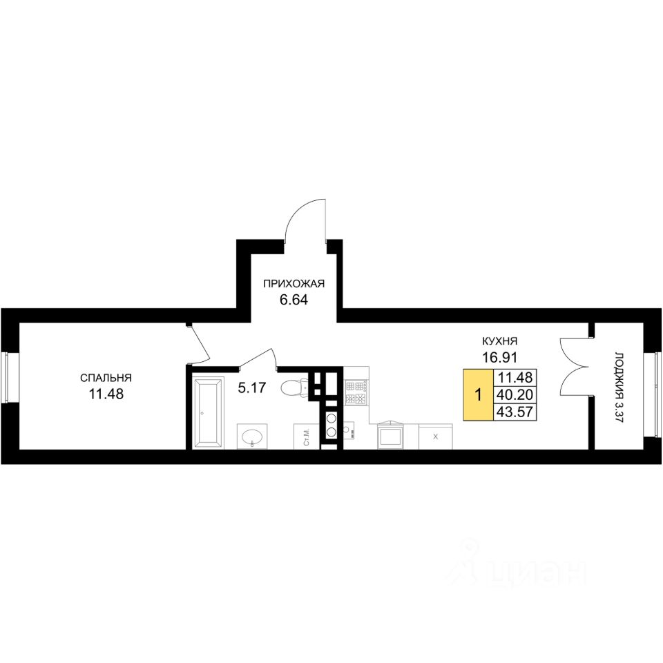 Общая площадь43,57 м²