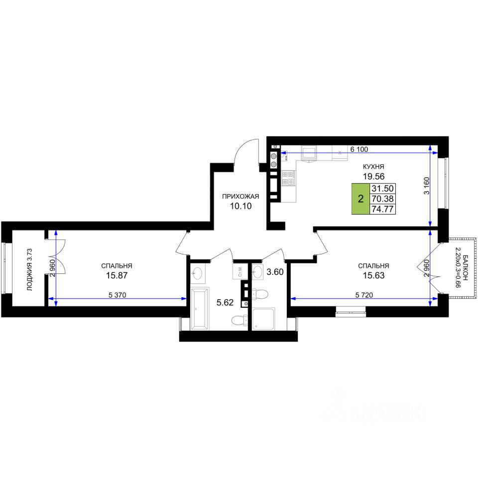 74,77 м²