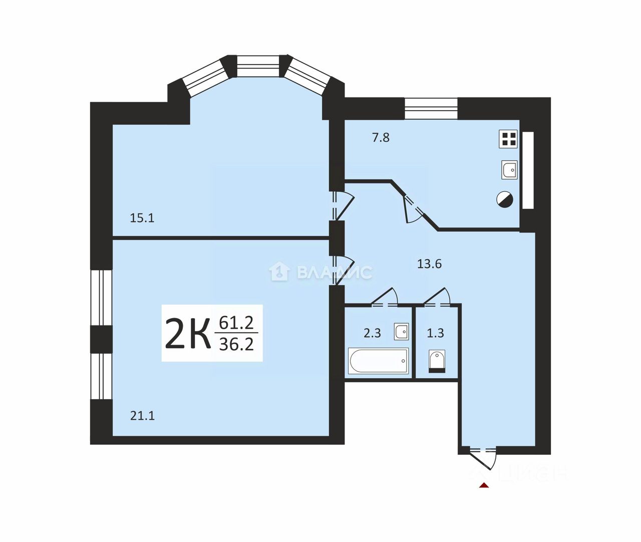 Общая площадь квартиры составляет 61, 2 кв. м, из которых 36, 2 кв. м — жилая площадь.
