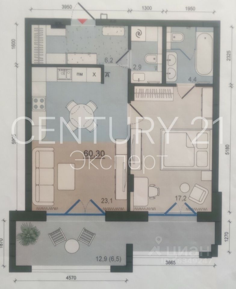 Общая площадь 60,3 кв.м. Мастер-спальня ( 17,2 кв. м.) со своей отдельной ванной комнатой (4,4 кв.м.), кухня - гостинная (23,1 кв.м.), терраса (12, 9 кв.м.), гостевой сан.узел (2,9 кв.м.)
