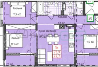 Общая площадь: 74 м². Кухня-гостиная: 21 м².
