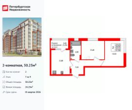 Удобная, классическая планировка, кухня 11.88 м², вместительная прихожая 7.43 м². Общая площадь квартиры - 50.23 м², жилая 24.23 м², высота потолка 2.7 м.