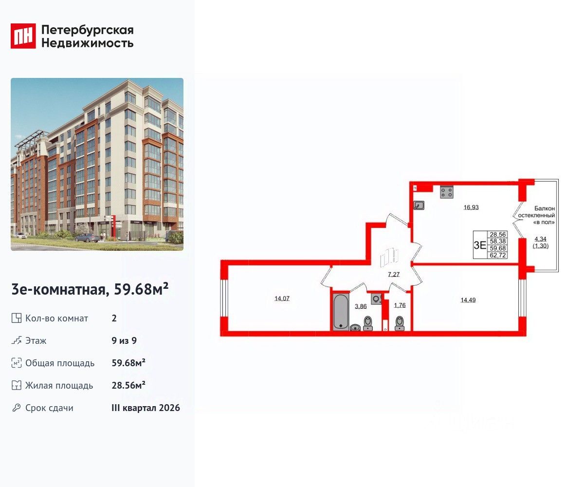 Удобная, классическая, функциональная европланировка, большая кухня-гостиная 16.93 м², вместительная прихожая 7.27 м². Общая площадь квартиры - 59.68 м², жилая 28.56 м², высота потолка 3 м.
