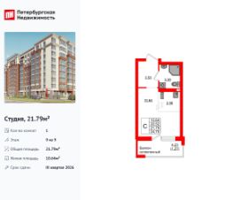 Удобная, классическая, функциональная европланировка, большая кухня-гостиная 2.96 м², просторная прихожая 3.53 м². Общая площадь студии - 21.79 м², жилая 10.64 м², высота потолка 3 м.