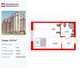 Удобная, классическая, функциональная европланировка, большая кухня-гостиная 3.55 м², просторная прихожая 3.31 м². Общая площадь студии - 24.42 м², жилая 13.32 м², высота потолка 2.7 м.