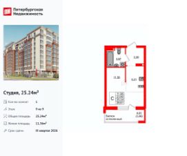 Удобная, классическая, функциональная европланировка, большая кухня-гостиная 5.21 м², просторная прихожая 3.36 м². Общая площадь студии - 25.24 м², жилая 11.56 м², высота потолка 3 м.
