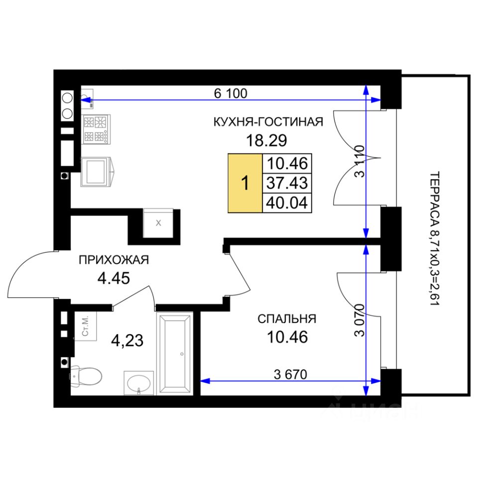 Общая площадь40,04 м²