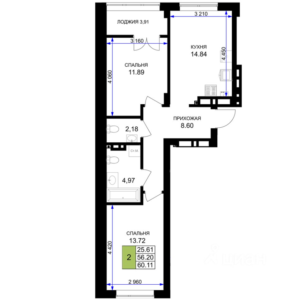Общая площадь60,9 м²