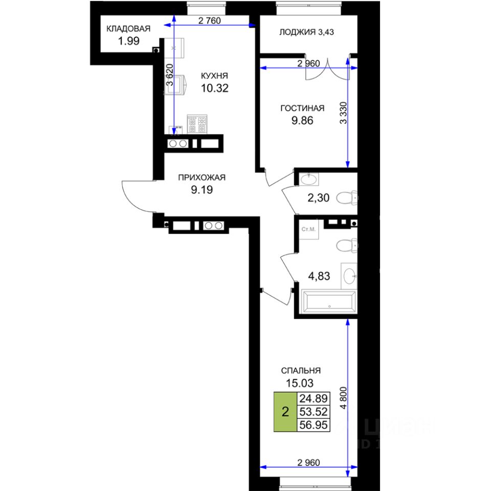 Общая площадь56,95 м²