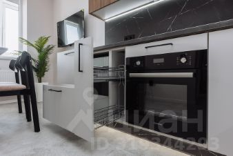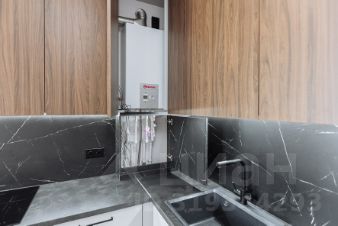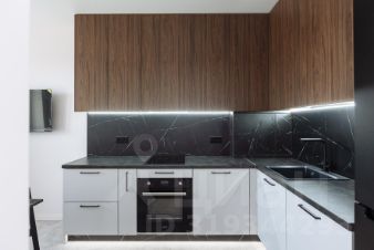 Установлена встроенная кухня с подсветкой и бытовой техникой (духовой шкаф, стиральная машина, варочная электрическая поверхность, вытяжка, газовый котел, холодильник)