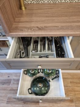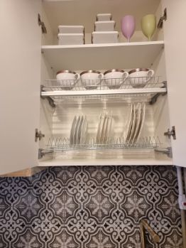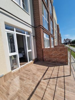 Площадь квартиры 39,5 кв.м. с изолированной спальней, кухня-столовая и диванная зона в отдельном помещении + 15,5 кв.м. комфортной террасы с маркизой и деревянной мебелью с видом на зеленую зону (угол дома ближе к морю, слышно шум моря).