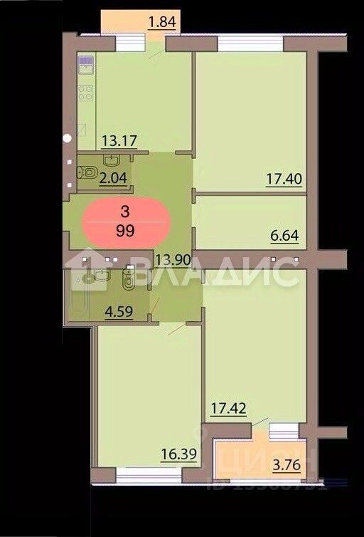 - три большие и изолированные комнаты (16,4 + 17,4 + 17,4 м²)