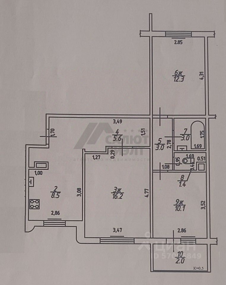 Комнаты изолированные (16.2 м2+12.3 м2+10.1 м2).