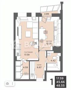 Квартира расположена на 8 этаже 25-этажного кирпично-монолитного дома, построенного в 2024 году. Общая площадь — 48,57 м², из которых 17,7 м² приходится на жилую площадь, а 13 м² — на кухню.