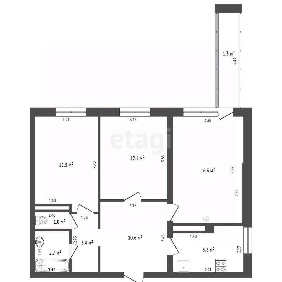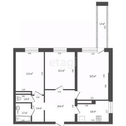 Три изолированные комнаты, одна из которых имеет выход на просторный балкон. Квартира расположена на 4 этаже 12 этажного панельного дома. Одним из преимуществ является наличие помещения для гардероба.