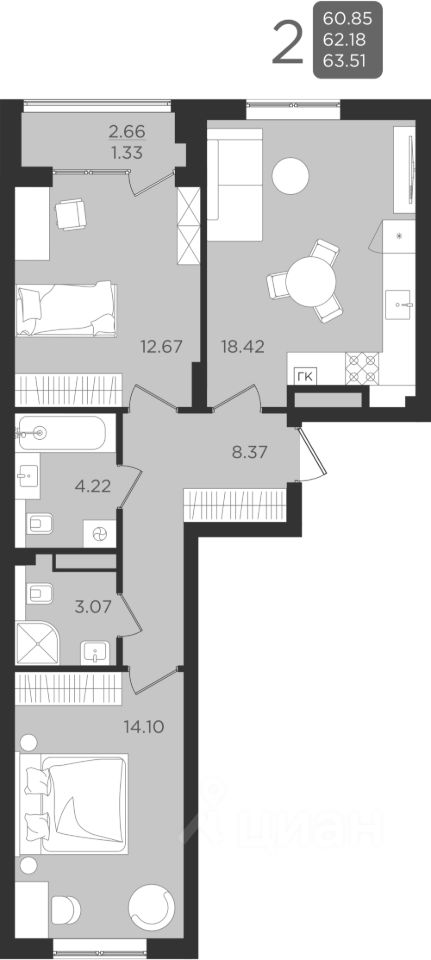 двухкомнатные от 60м2, трехкомнатные от 70м2.