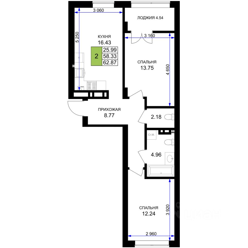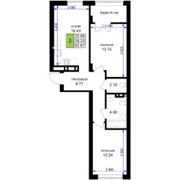 Общая площадь62,87 м²